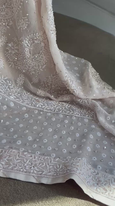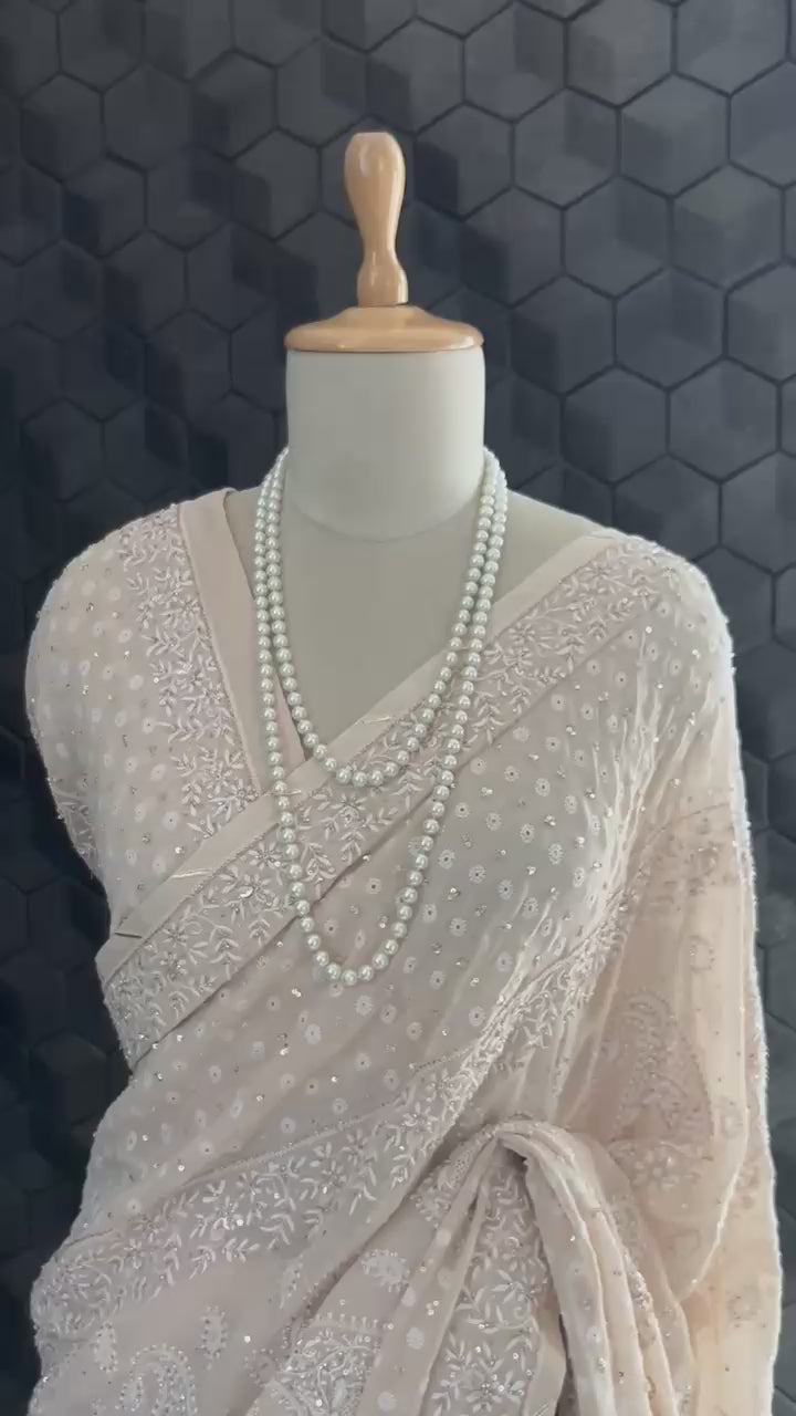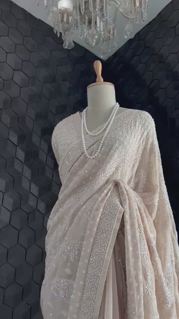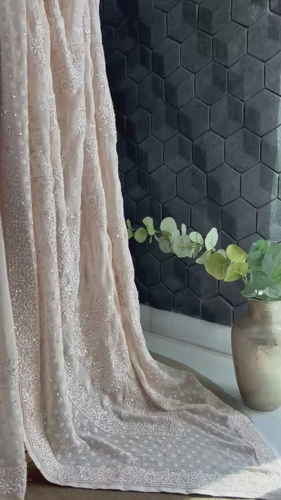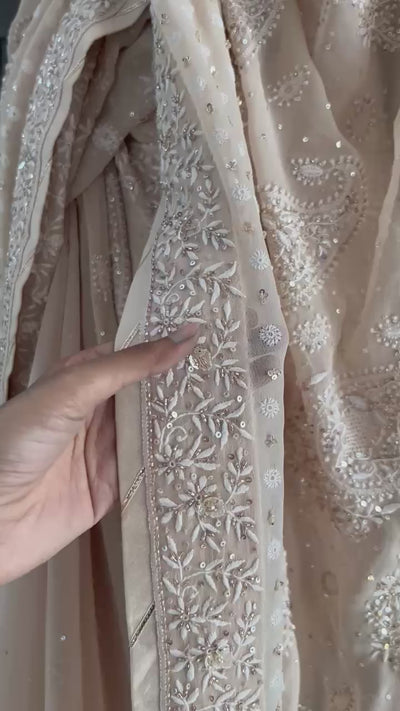 Beige Ek-Taar Chikankari Saree crafted with intricate all-over jaal embroidery, beautifully highlighted with delicate sequins work throughout. The saree features a sophisticated four-side gota patti lace backing style, adding a refined traditional finish to the borders. It comes paired with a matching chikankari-embroidered blouse, designed in the same tone and workmanship for a seamless coordinated look.