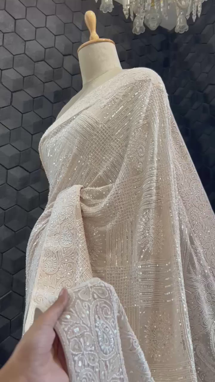 Stunning champagne georgette Chikankari saree adorned with intricate all-over sequin work, featuring a harmonious blend of floral motifs and box-pattern designs that showcase exceptional craftsmanship. The delicate shimmer enhances its elegance, making it perfect for grand occasions. Paired with a matching embroidered blouse fabric crafted in the same rich detailing, this ensemble exudes timeless sophistication and refined charm.