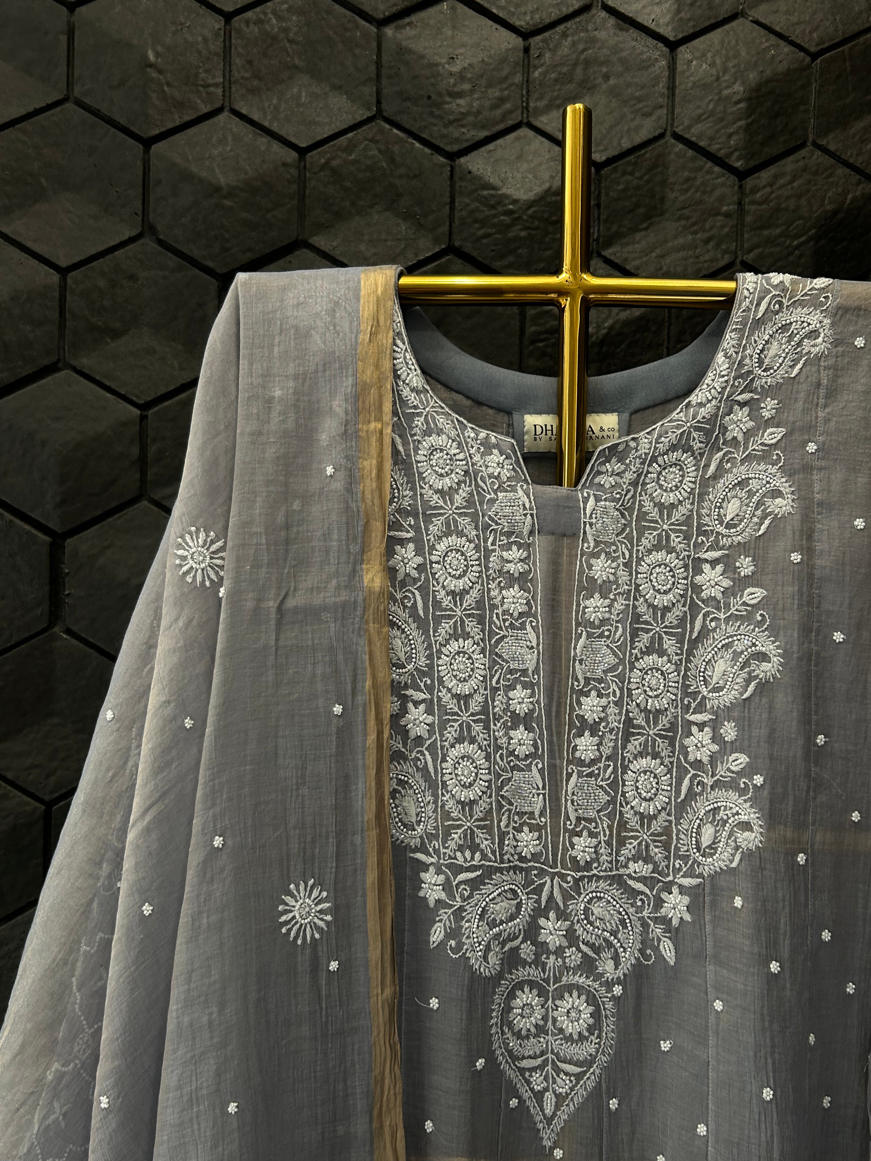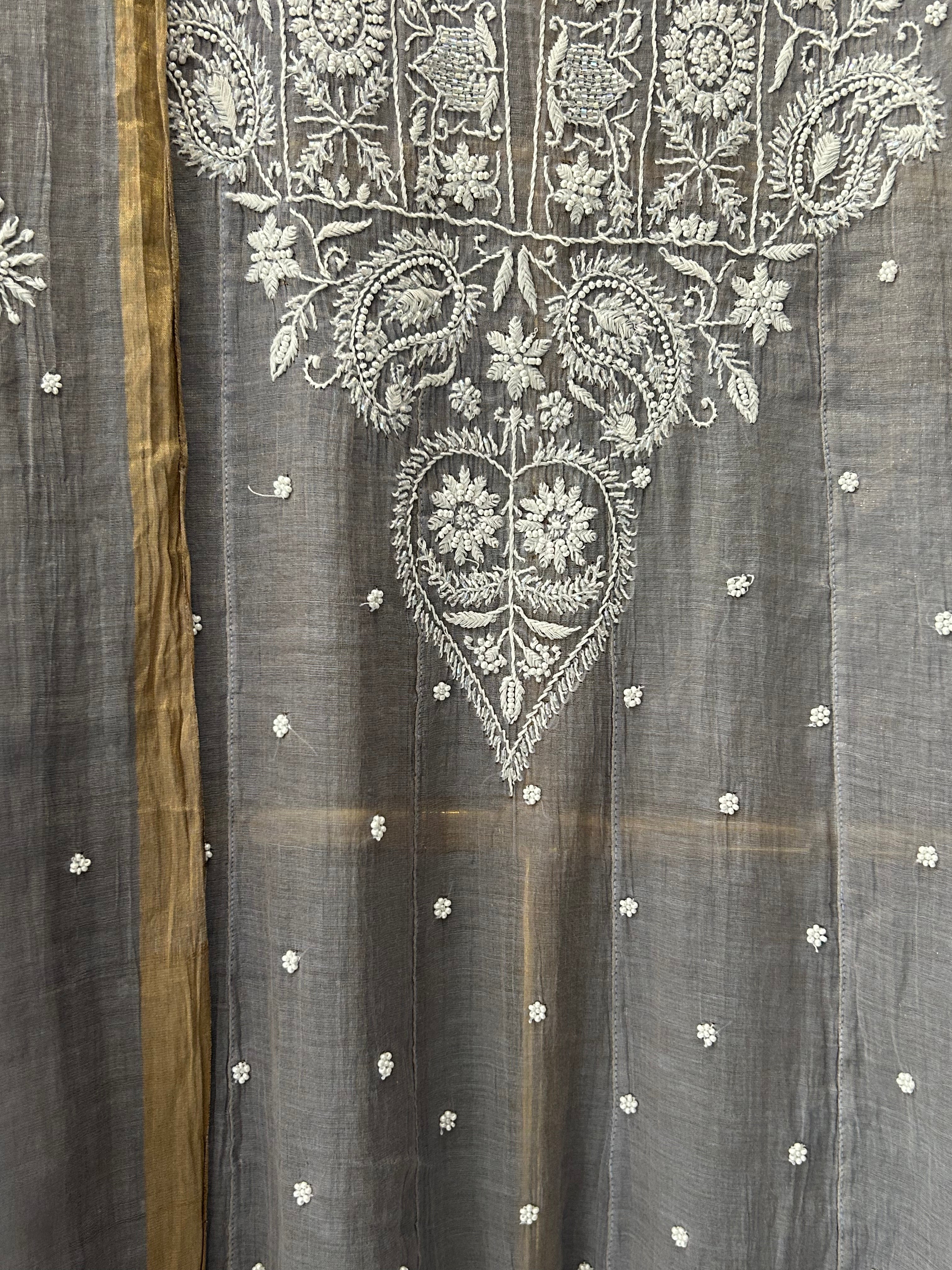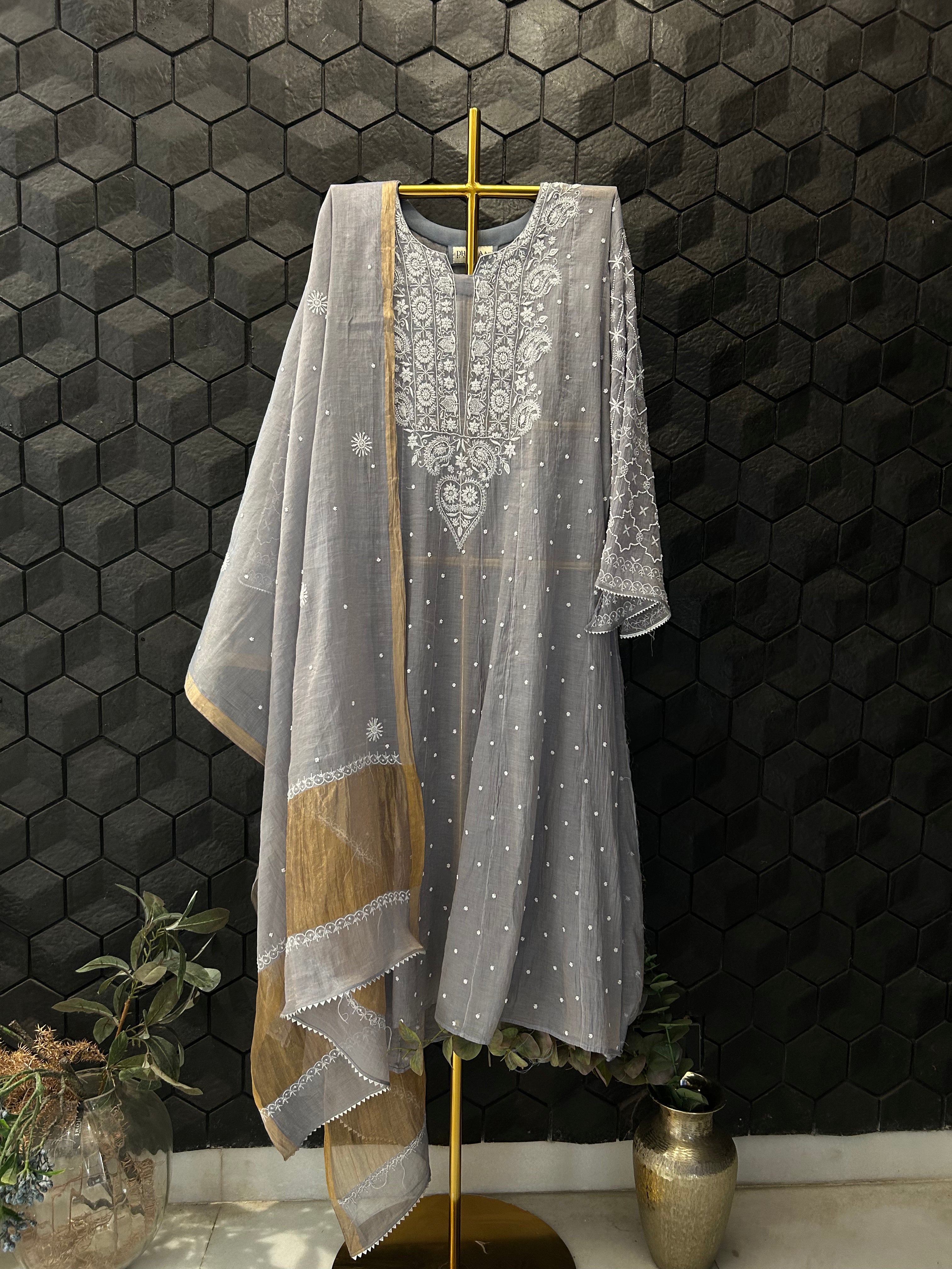 Grey Golden tissue Chikankari Anarkali Set, heavy front with chikankari embroidery , cut-dana and beads work with boota on the back. Paired a detailed dupatta with lace on it.