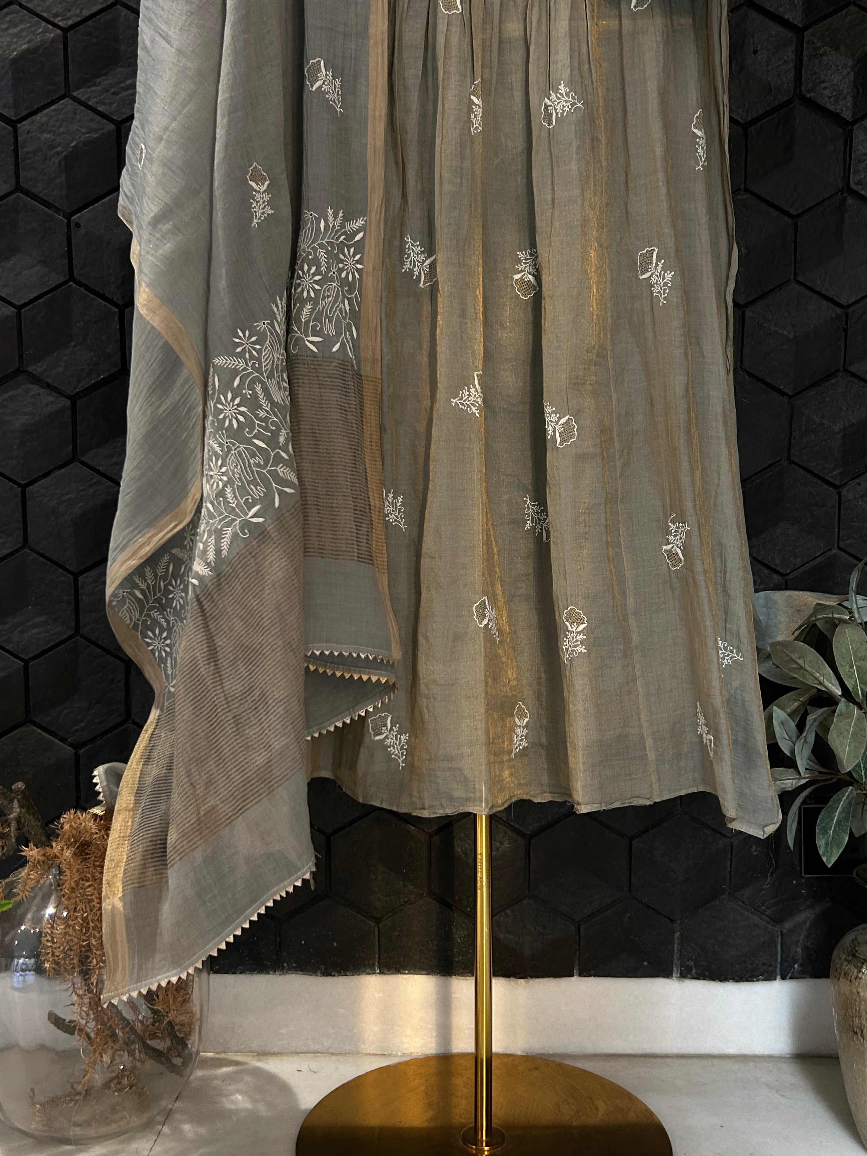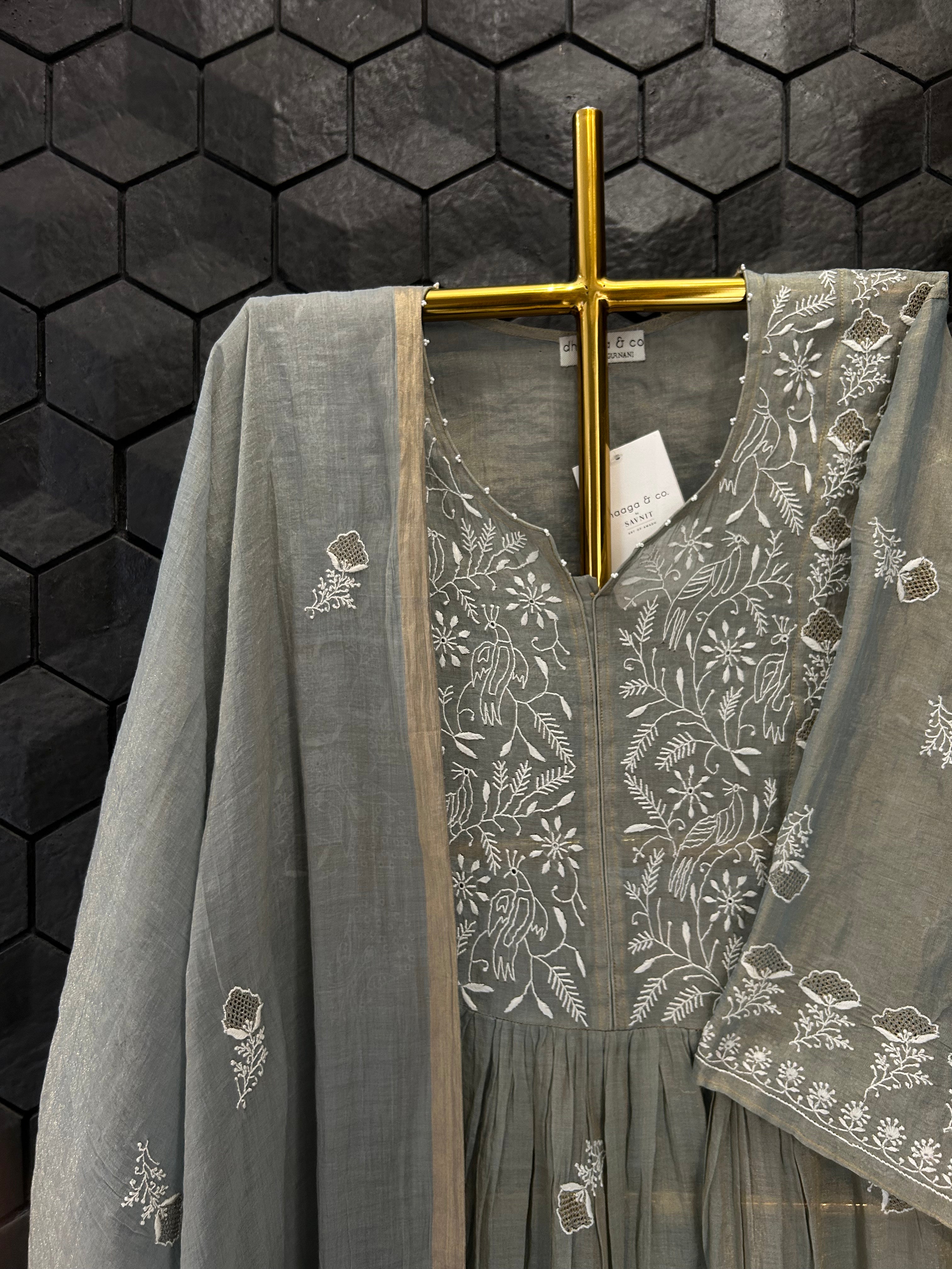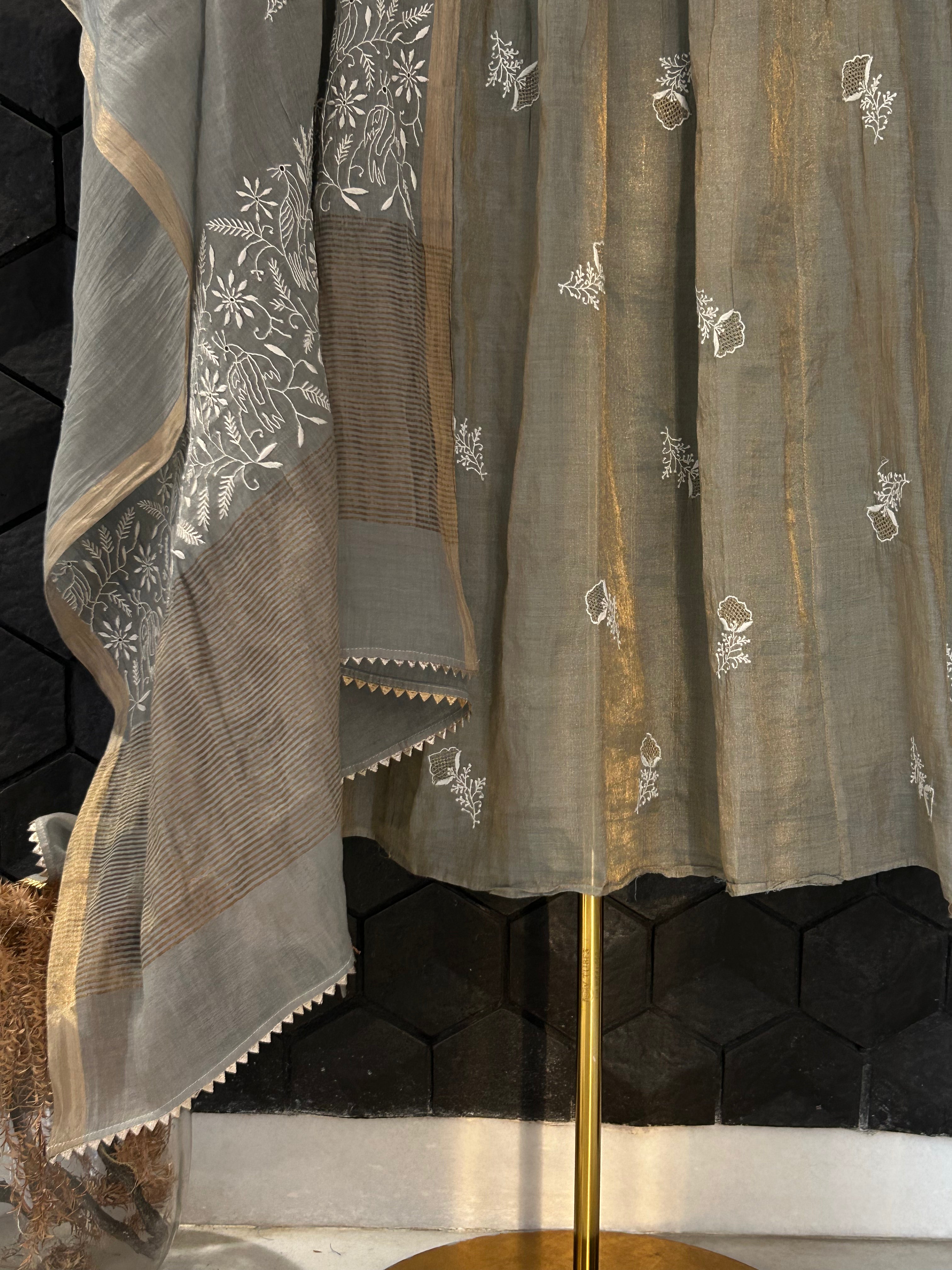 Grey Tissue Chikankari kurta Set front tuck with white embroidery .Paired with delicate dupatta .