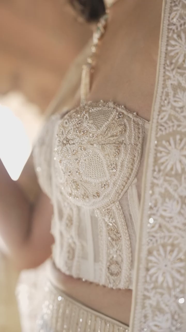 Kareena Kapoor Khan in our ivory and gold ek-taar Chikankari lehenga set elegance meets tradition meticulously handcrafted on pure Georgette fabric with ek-taar chikankari all-over. Our skilled artisans have poured their expertise into every stitch, creating a masterpiece that blends the timeless charm of Chikankari with the opulence of Aari and Zardozi work.