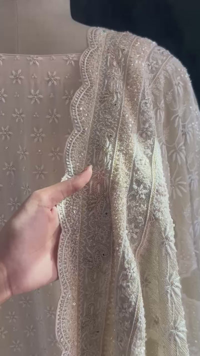 our ivory georgette gold embroidered ek-taar Chikankari sharara set with jaali Work typically refers to an elegant traditional Indian outfit. The fabric is light, sheer, and flowy, making it ideal for special occasions.