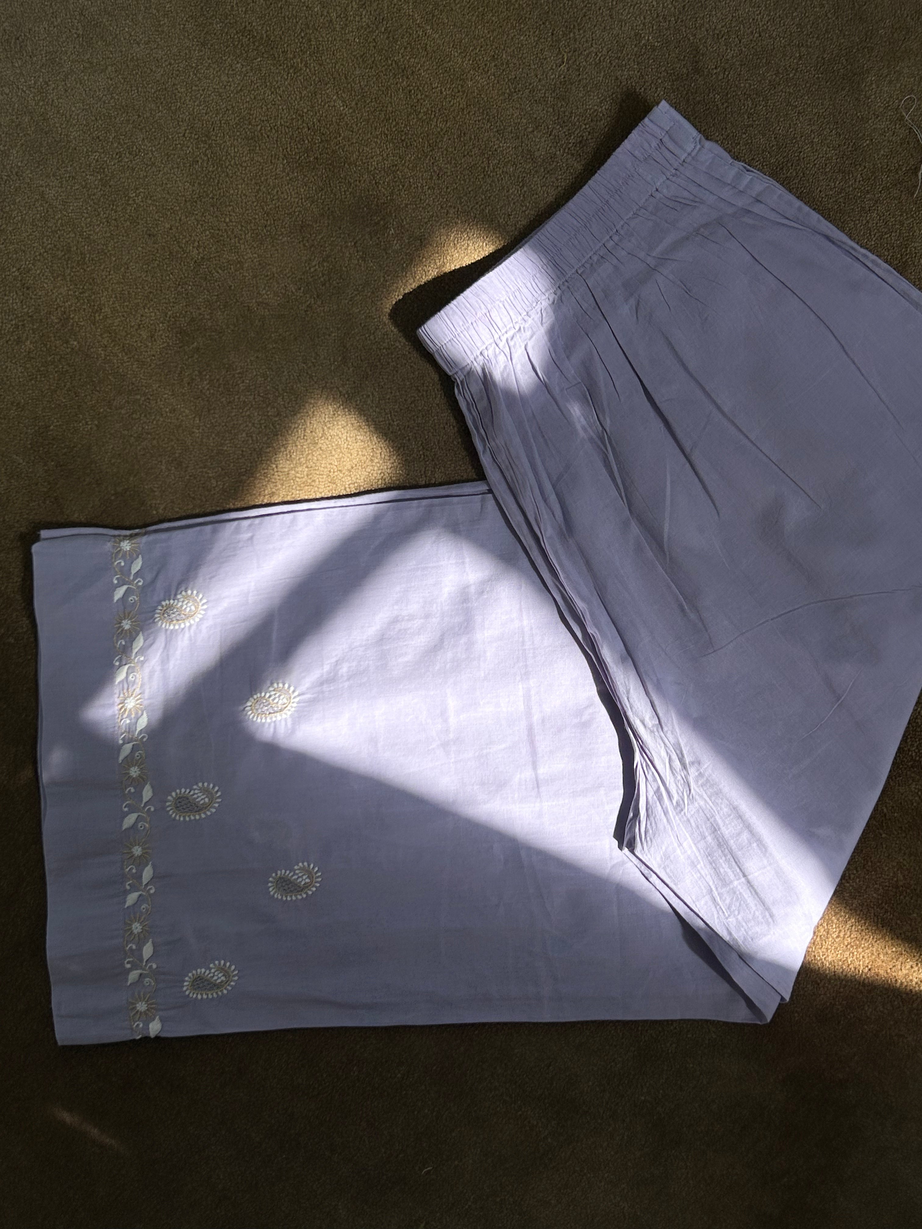Lilac Cotton Chikankari Co-ord sets, decent embroidery on front yoke and statement boota on the back with detailing and sleeves. Paired with embroidered pants .