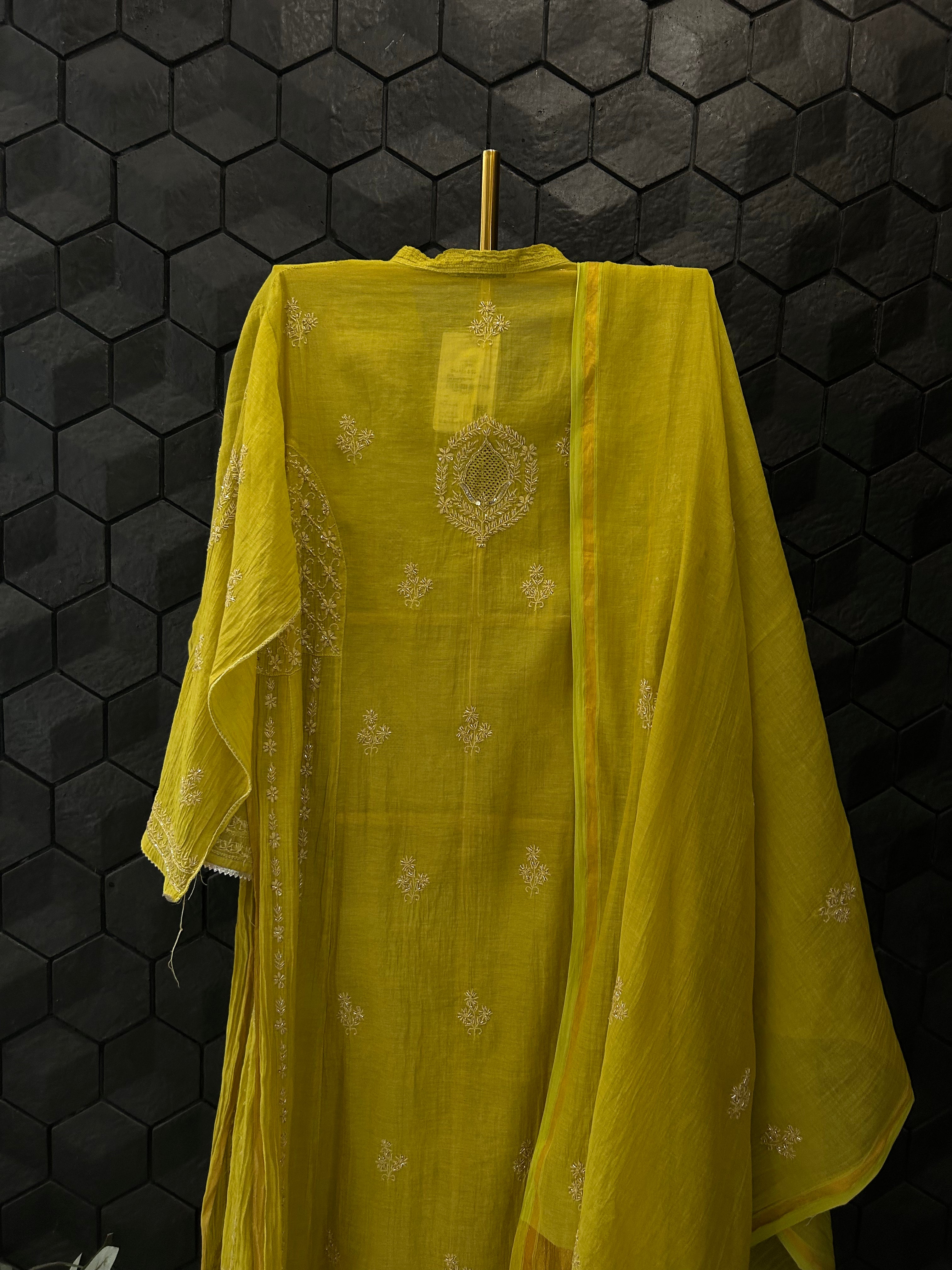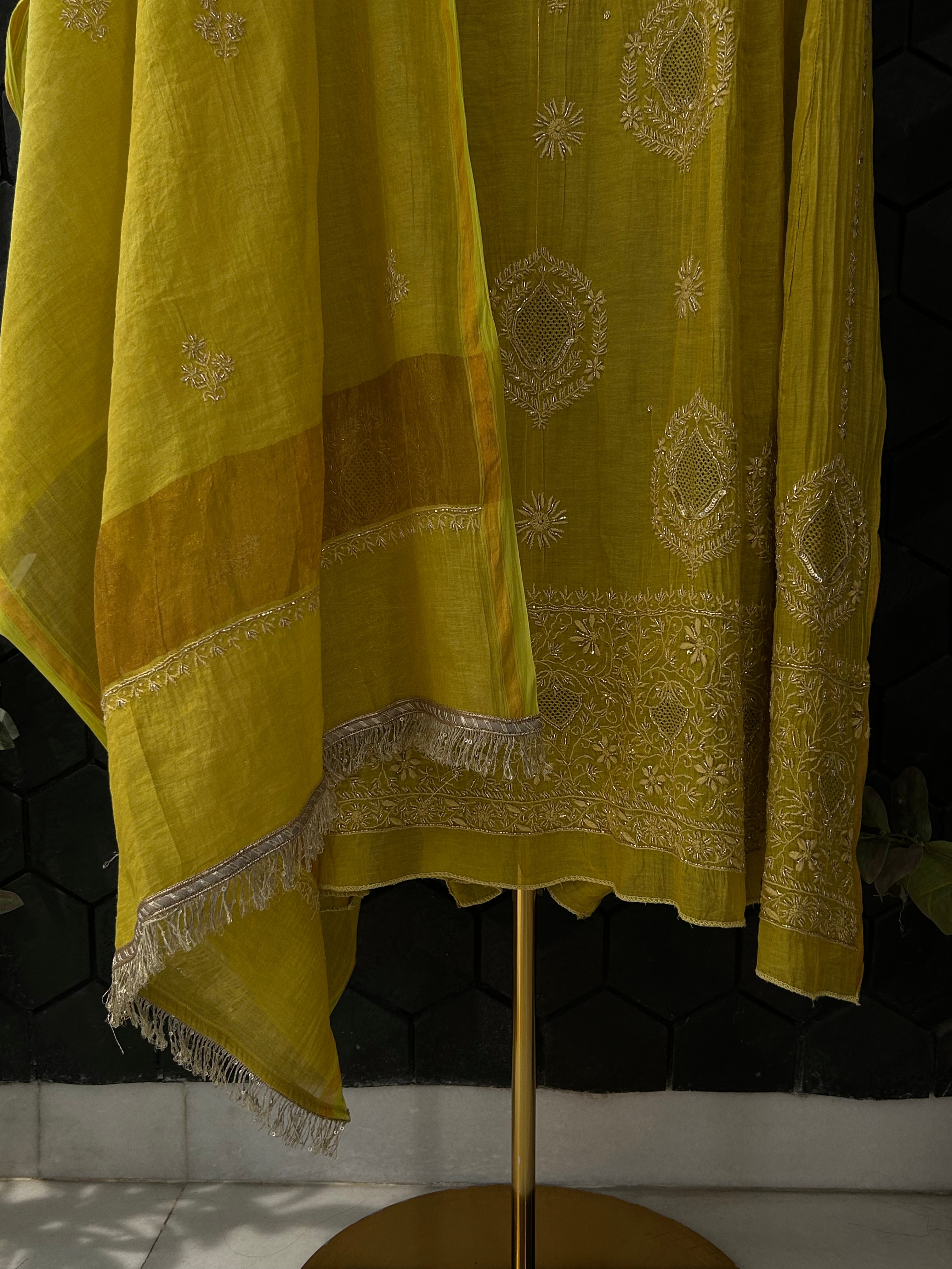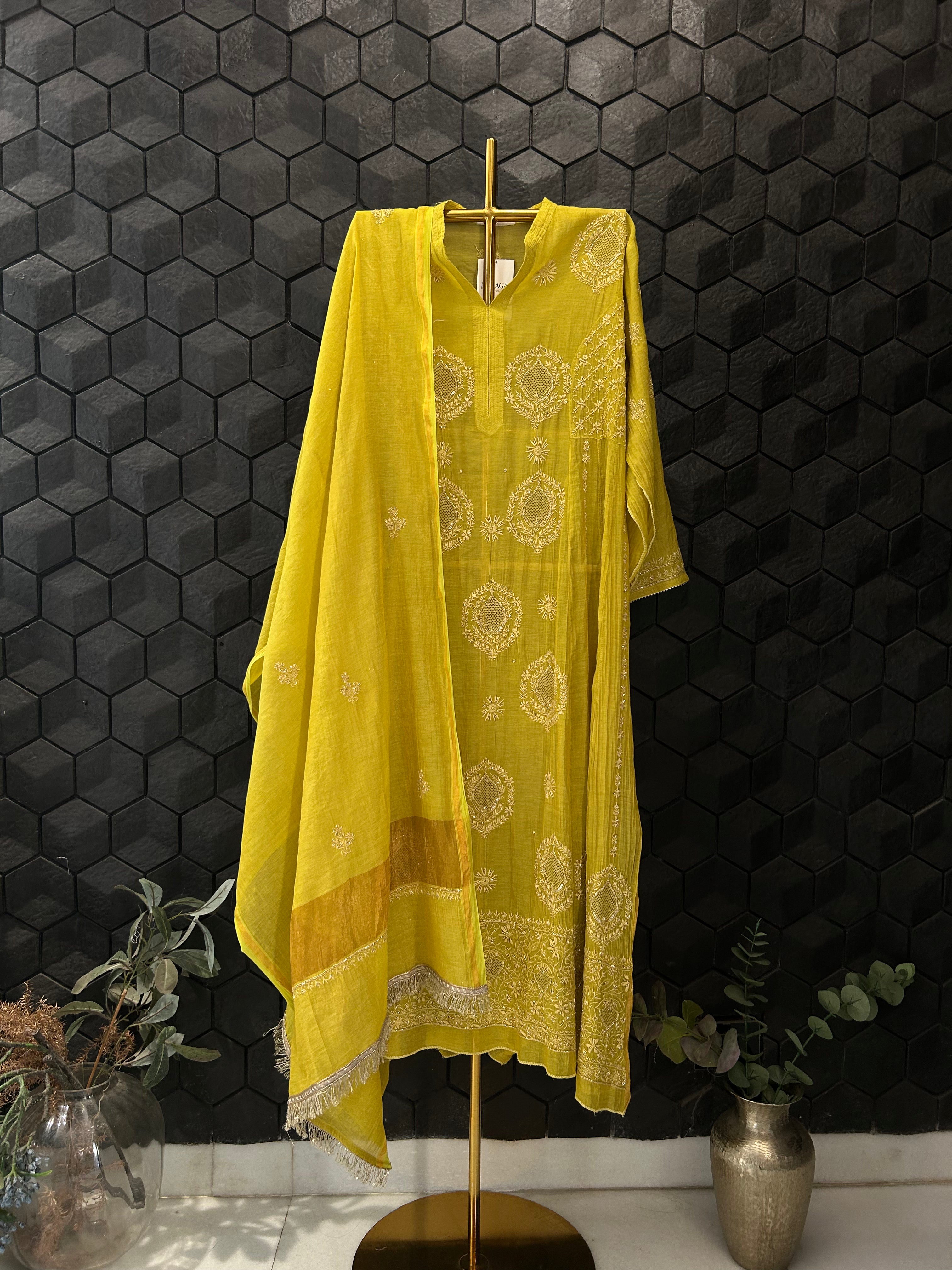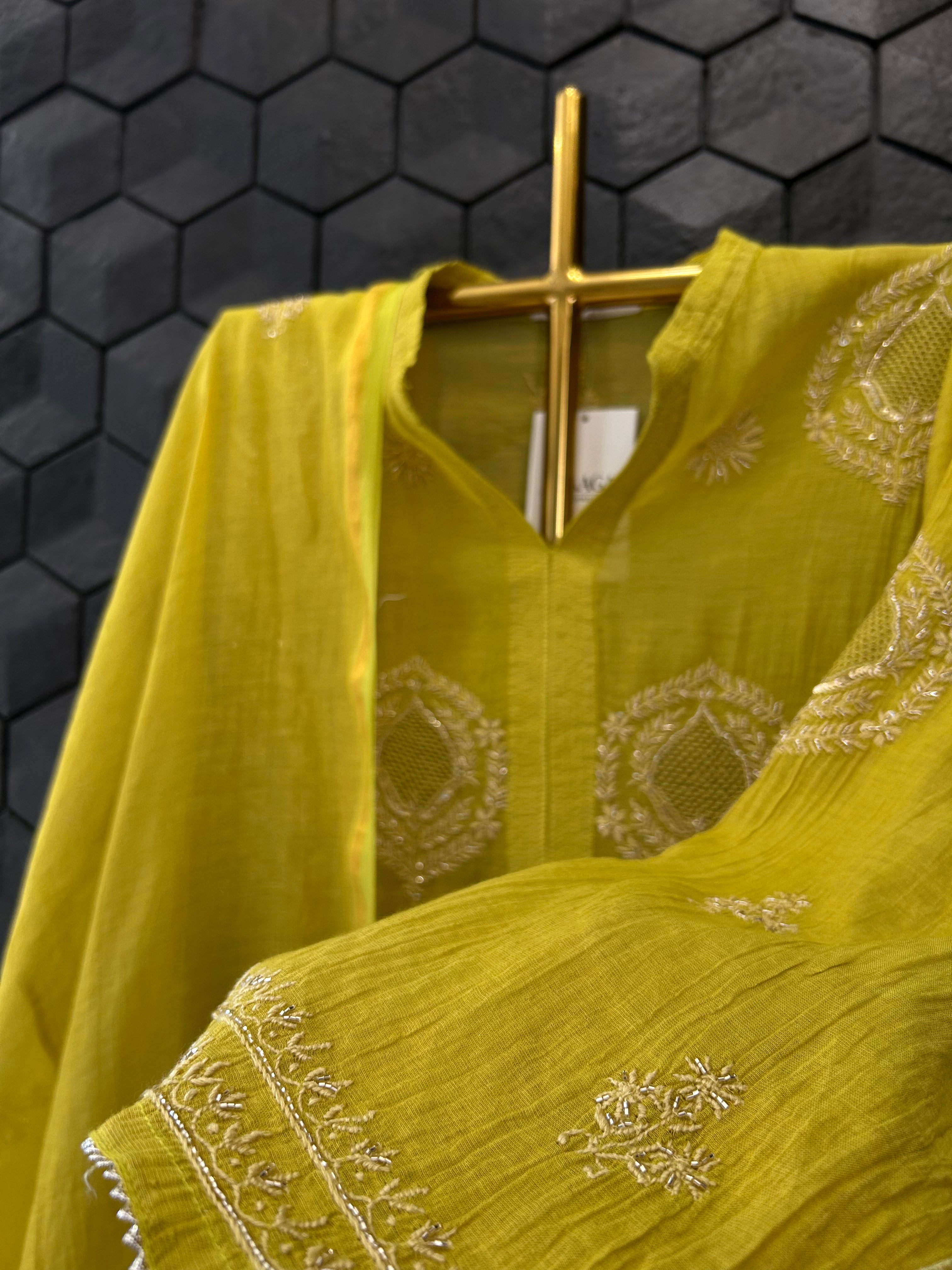Lime Green Golden Tissue Chikankari kurta Set with embellished neck with intricate chikankari embroidery, cutdana and sequence work. Paired with a dupatta.