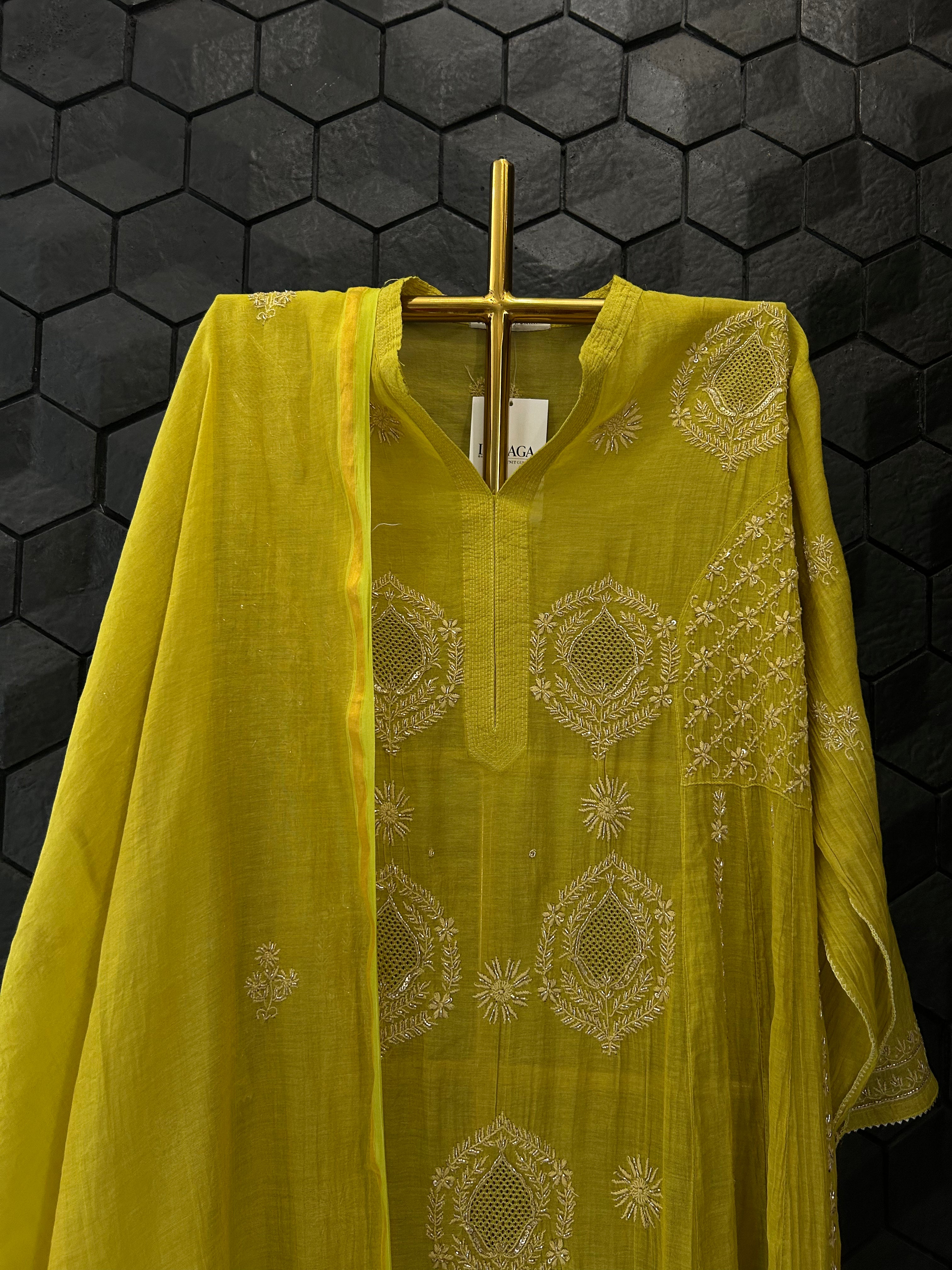 Lime Green Golden Tissue Chikankari Kurta Set