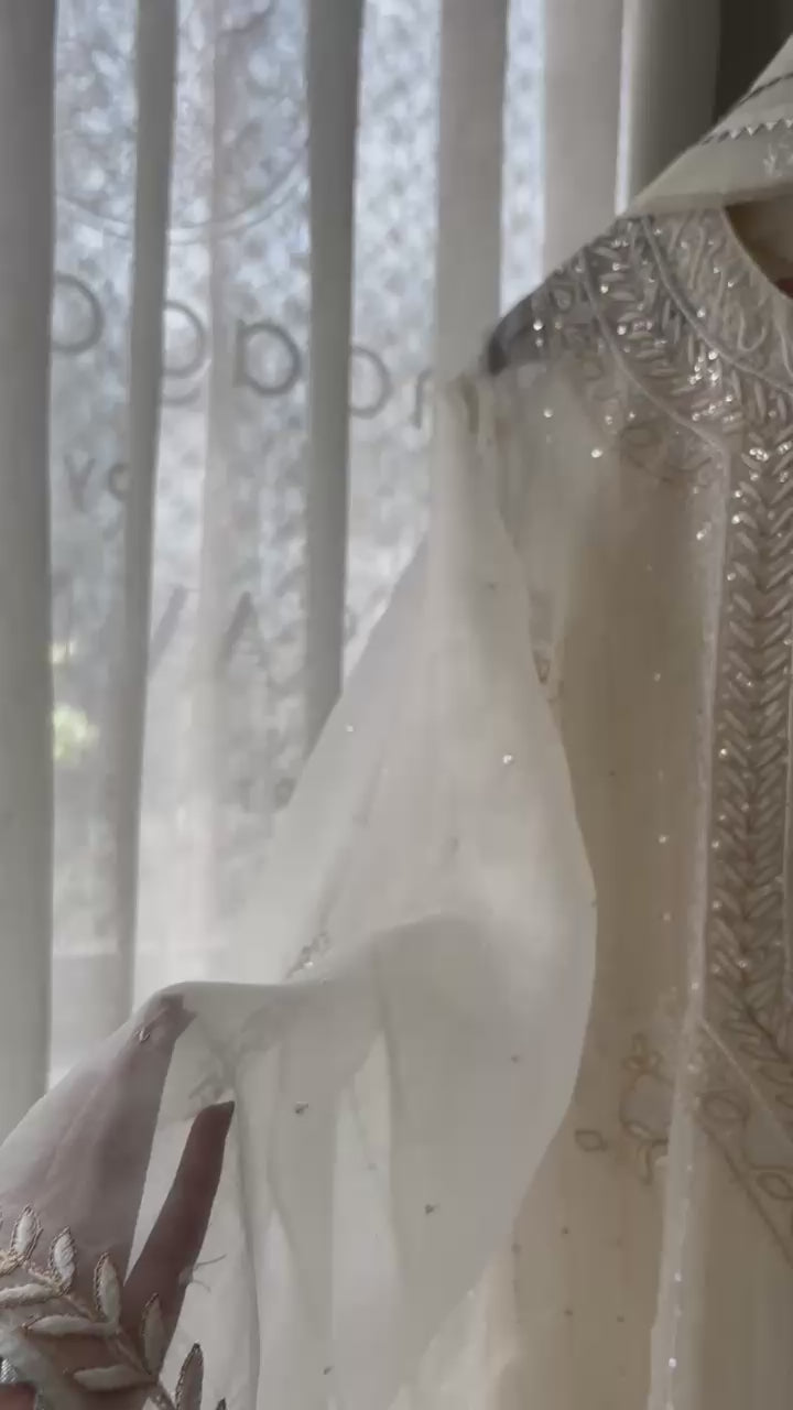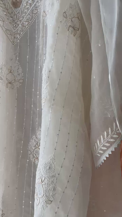 Featuring white organza chikankari straight kurta set is a fusion of grace with heavy embellished front or statement jaal work and boota on the back. Paired with elegant organza dupatta. It's an ideal choice for those seeking a refined and sophisticated look, making a statement at special occasions with its intricate detailing and elegant silhouette.