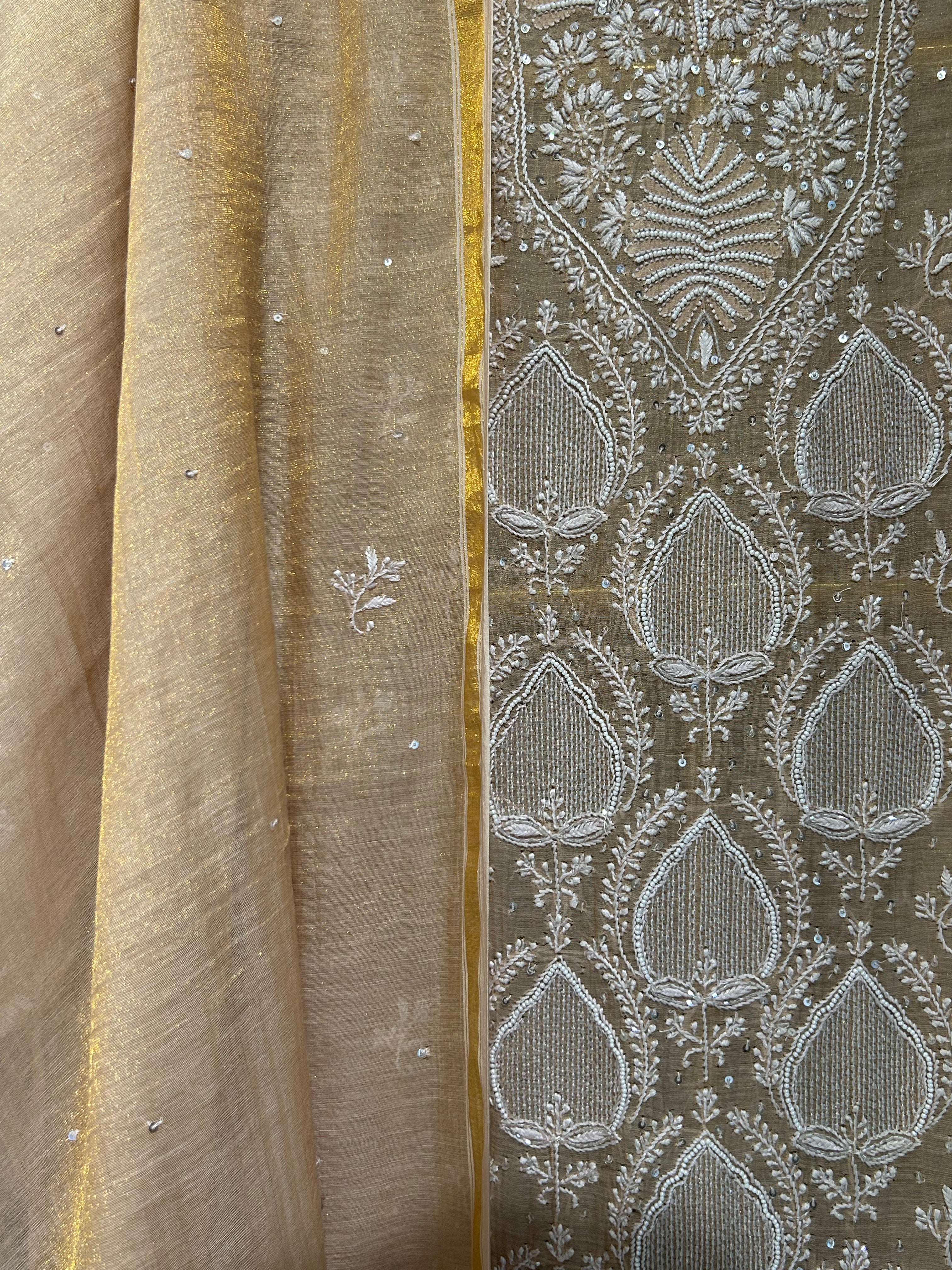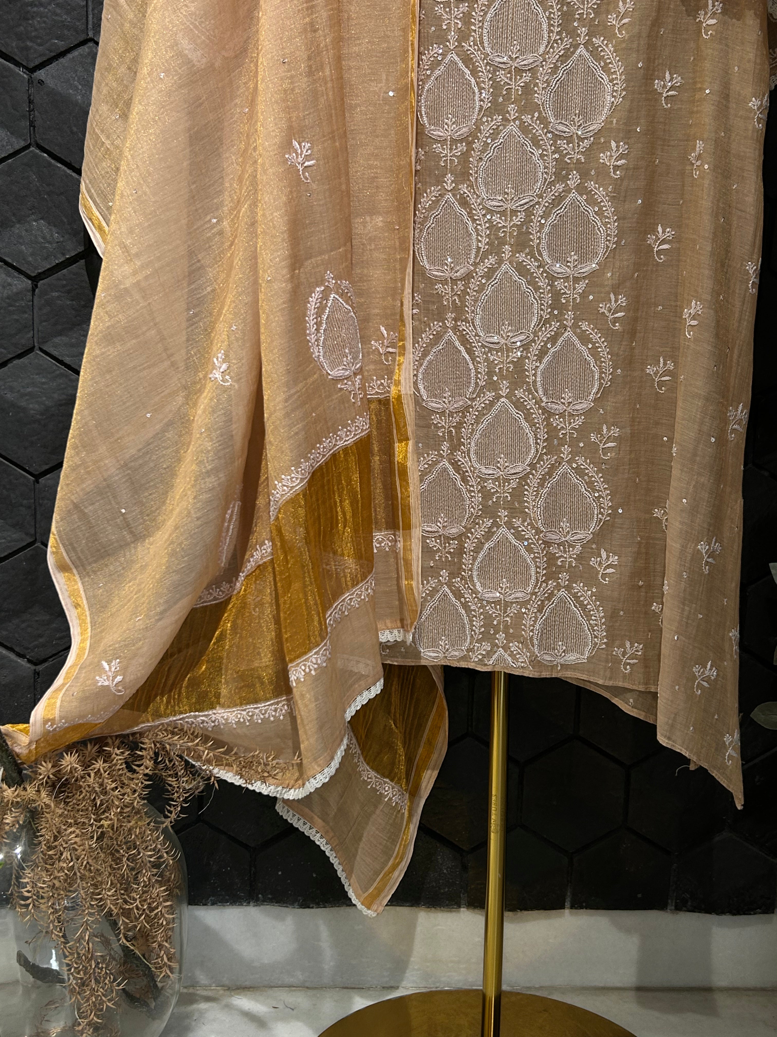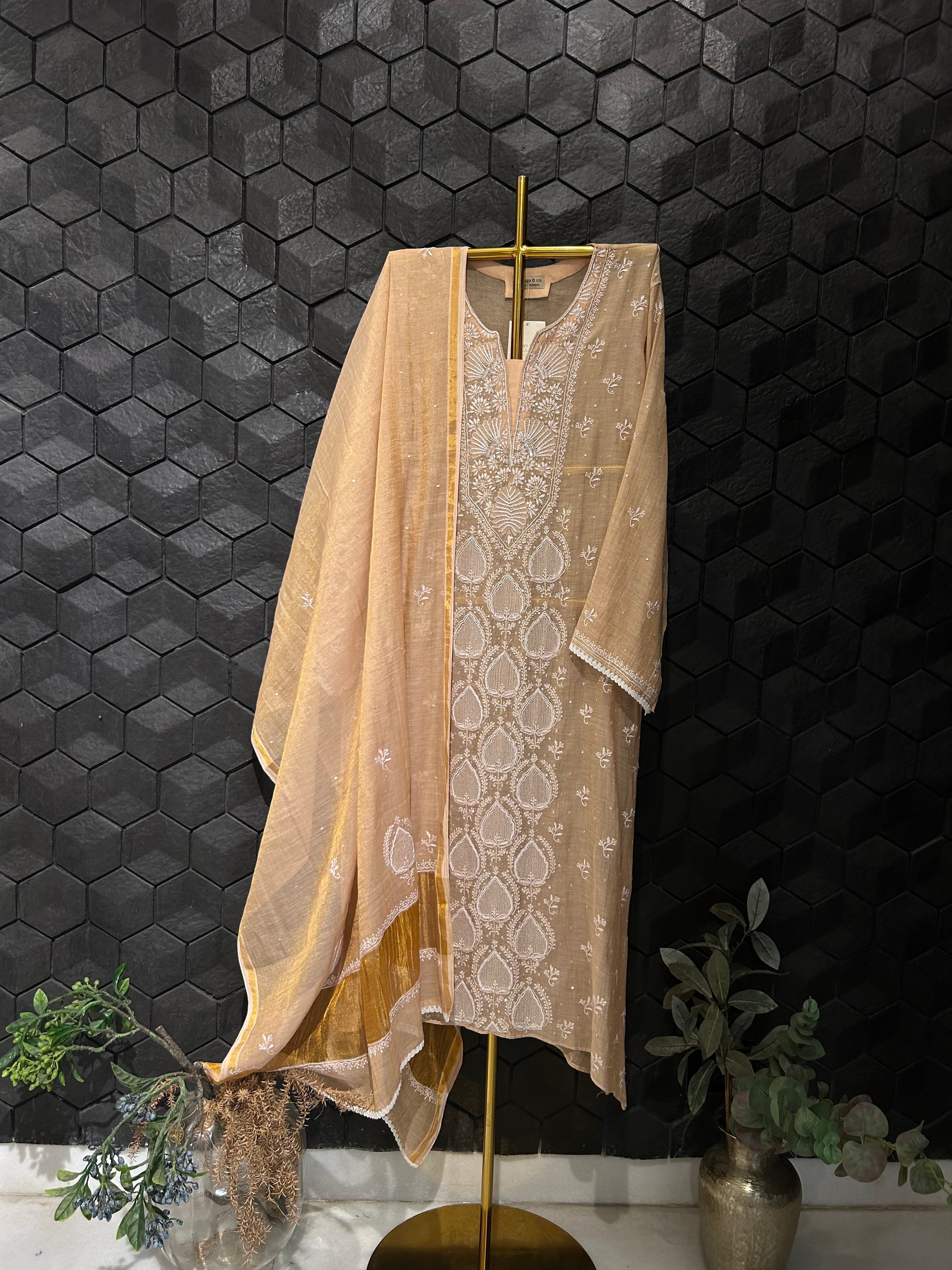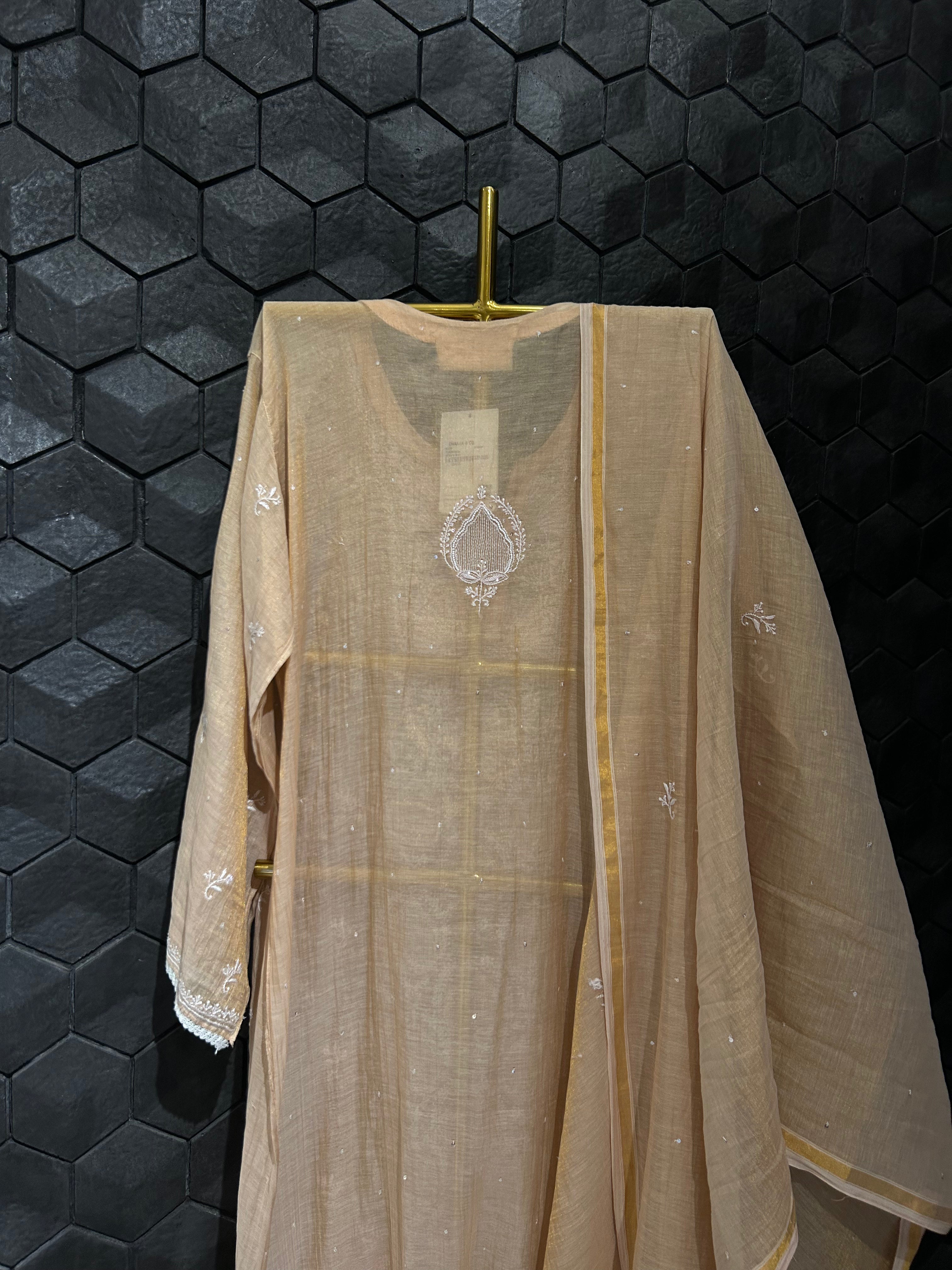 Peach Tissue Chikankari Kurta Set