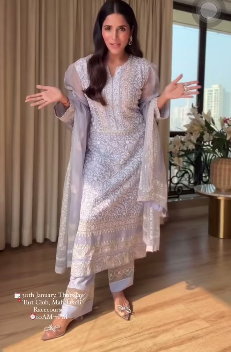 Mitali from House of Misu in our Periwinkle Premium Organza Chikankari Kurta Set