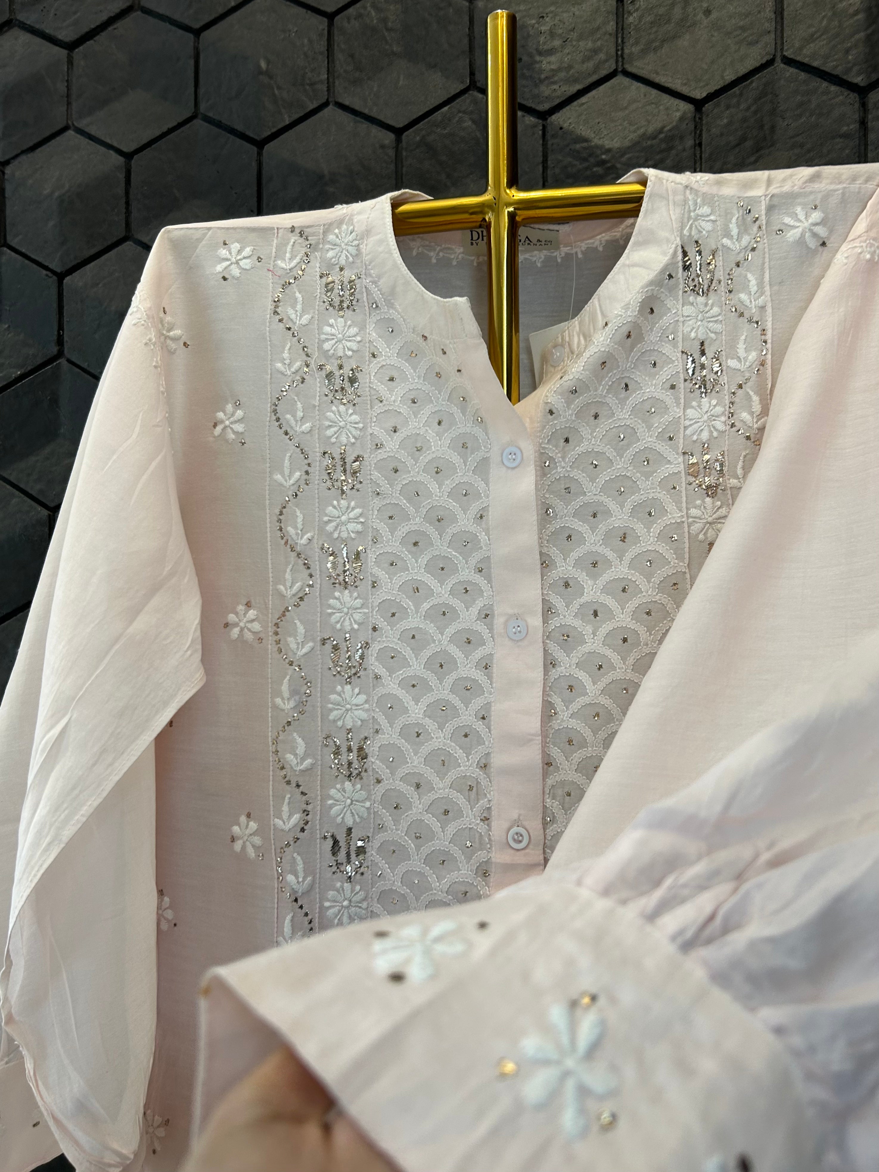 Elegant Co-ord sets crafted in soft pink chanderi silk ,featuring intricate hand -done chikankari embroidery adorned with delicate Mukaish highlights .Comes with coordinated pants for a graceful yet contemporary look.