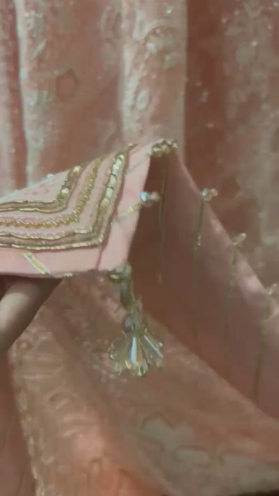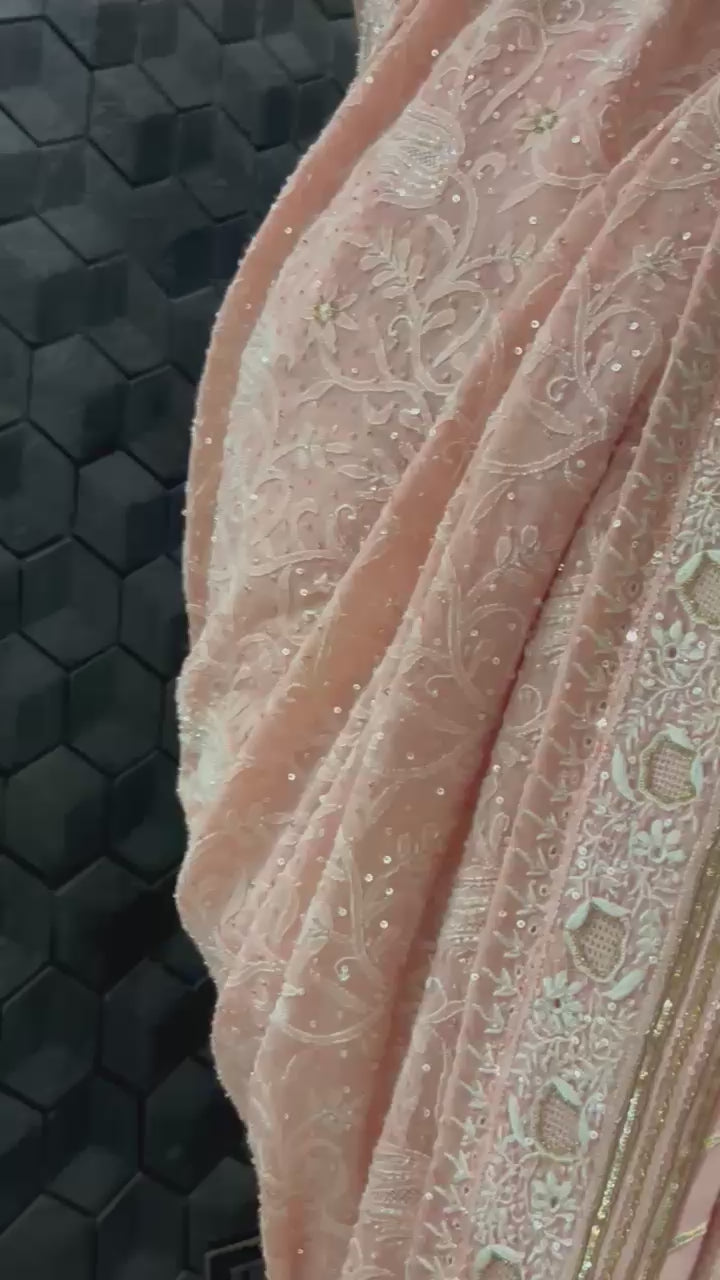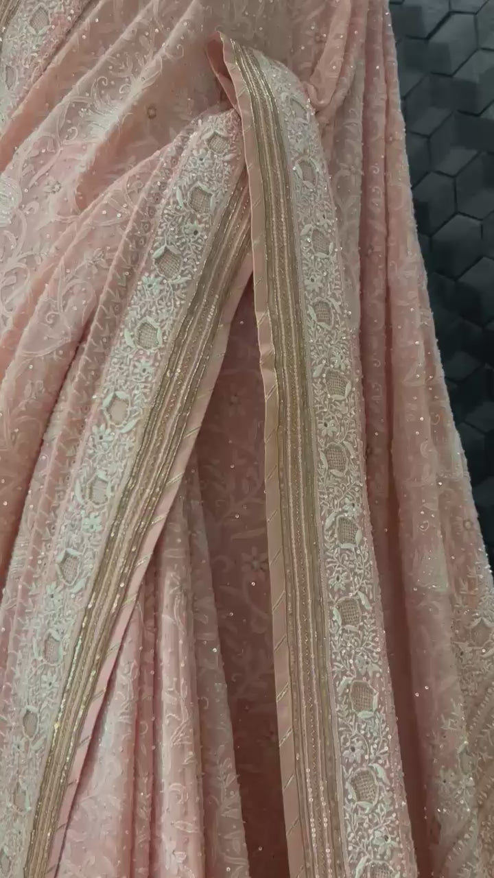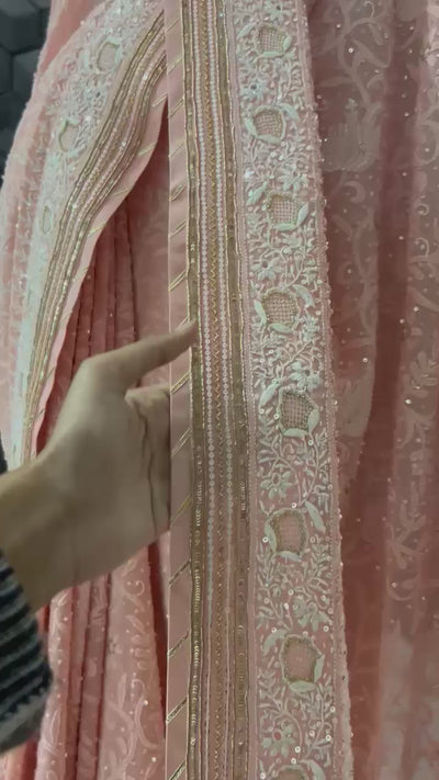 Pink Ek-Taar Chikankari Saree crafted with intricate all-over jaal embroidery, beautifully highlighted with delicate sequins work throughout. The saree features a sophisticated four-side gota patti lace backing style, adding a refined traditional finish to the borders. It comes paired with a matching chikankari-embroidered blouse, designed in the same tone and workmanship for a seamless coordinated look.