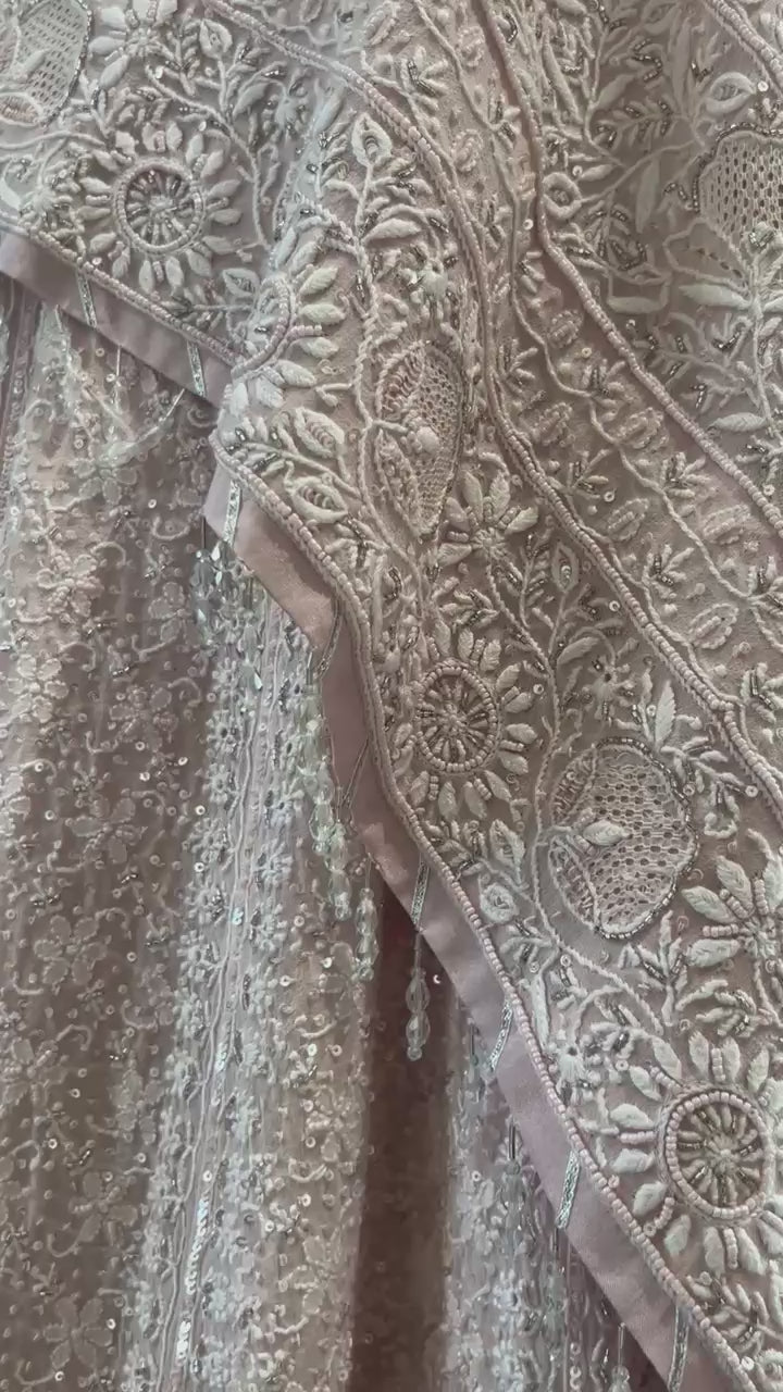 Pink ek-taar chikankari lehenga set elegance meets tradition meticulously handcrafted on pure Georgette fabric with ek-taar chikankari all-over with statement jaal work. Our skilled artisans have poured their expertise into every stitch, creating a masterpiece that blends the timeless charm of Chikankari with the opulence of Aari and Zardozi work.