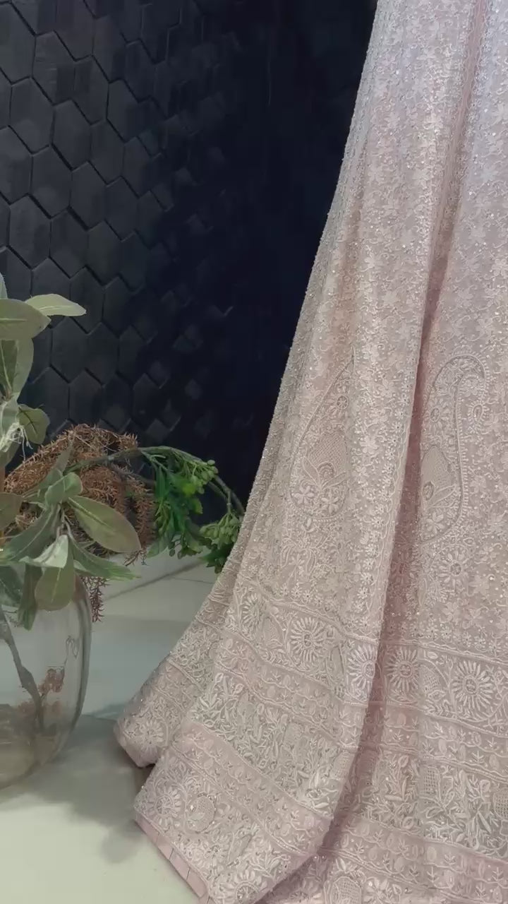 This exquisite lehenga is designed for those who seek the perfect blend of heritage and contemporary style. The beauty of this Georgette Chikankari Lehenga lies in the mix of exquisitecut-dana work,it has 12 kalis and heavy embroidered dupatta along with heavy embroidered unstitched blouse.