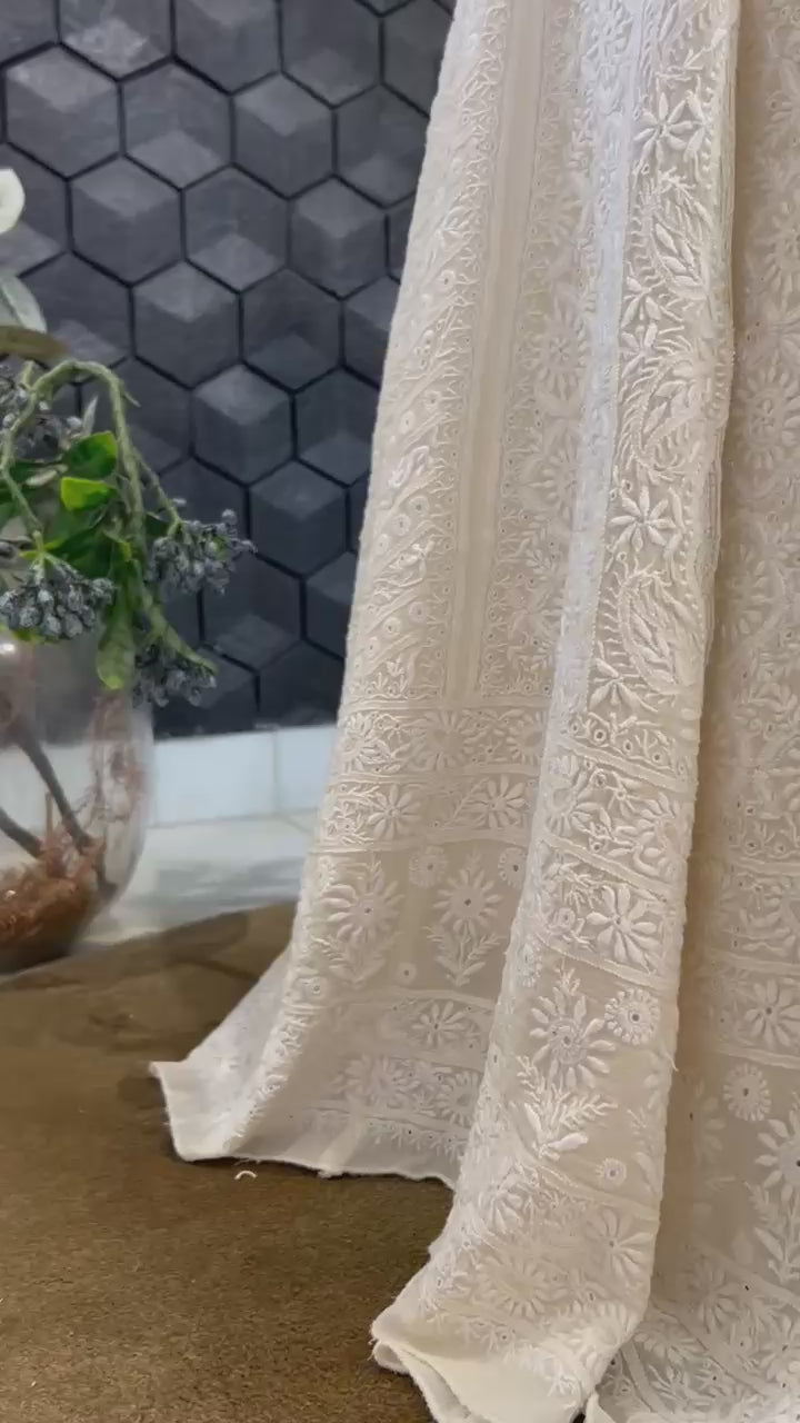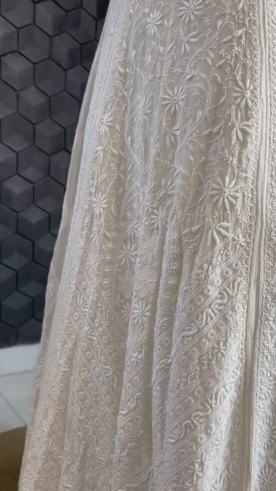 Crafted in soft white georgette, this Chikankari skirt is adorned with intricate all-over floral hand embroidery, creating a light, airy, and graceful silhouette. The silver kasab jaali embroidered flows beautifully with delicate detailing throughout.