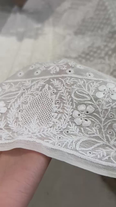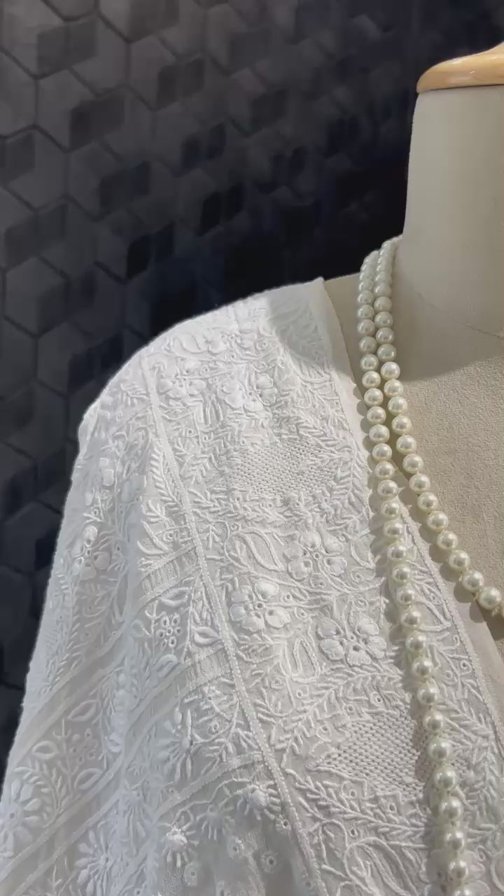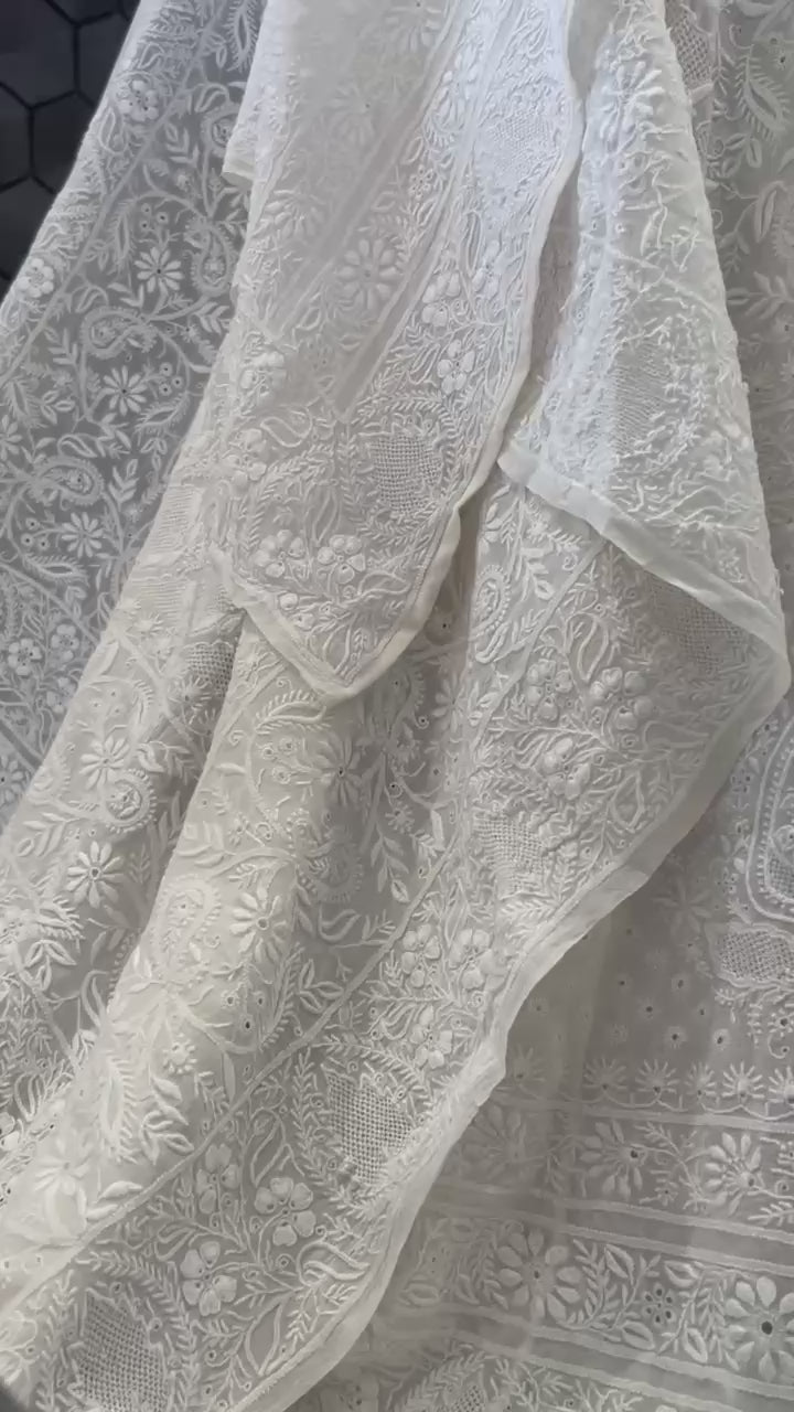 Crafted in soft white georgette, this ek-taar Chikankari lehenga is adorned with intricate all-over jaal hand embroidery, creating a light, airy, and graceful silhouette. The lehenga flows beautifully with delicate detailing throughout, paired with a matching embroidered blouse fabric that complements the ensemble perfectly. The statement dupatta features elegant peacock motifs and fine Chikankari work, adding a subtle touch of regal charm. A timeless and refined set, ideal for intimate weddings, festive occasions, and heritage-inspired celebrations.