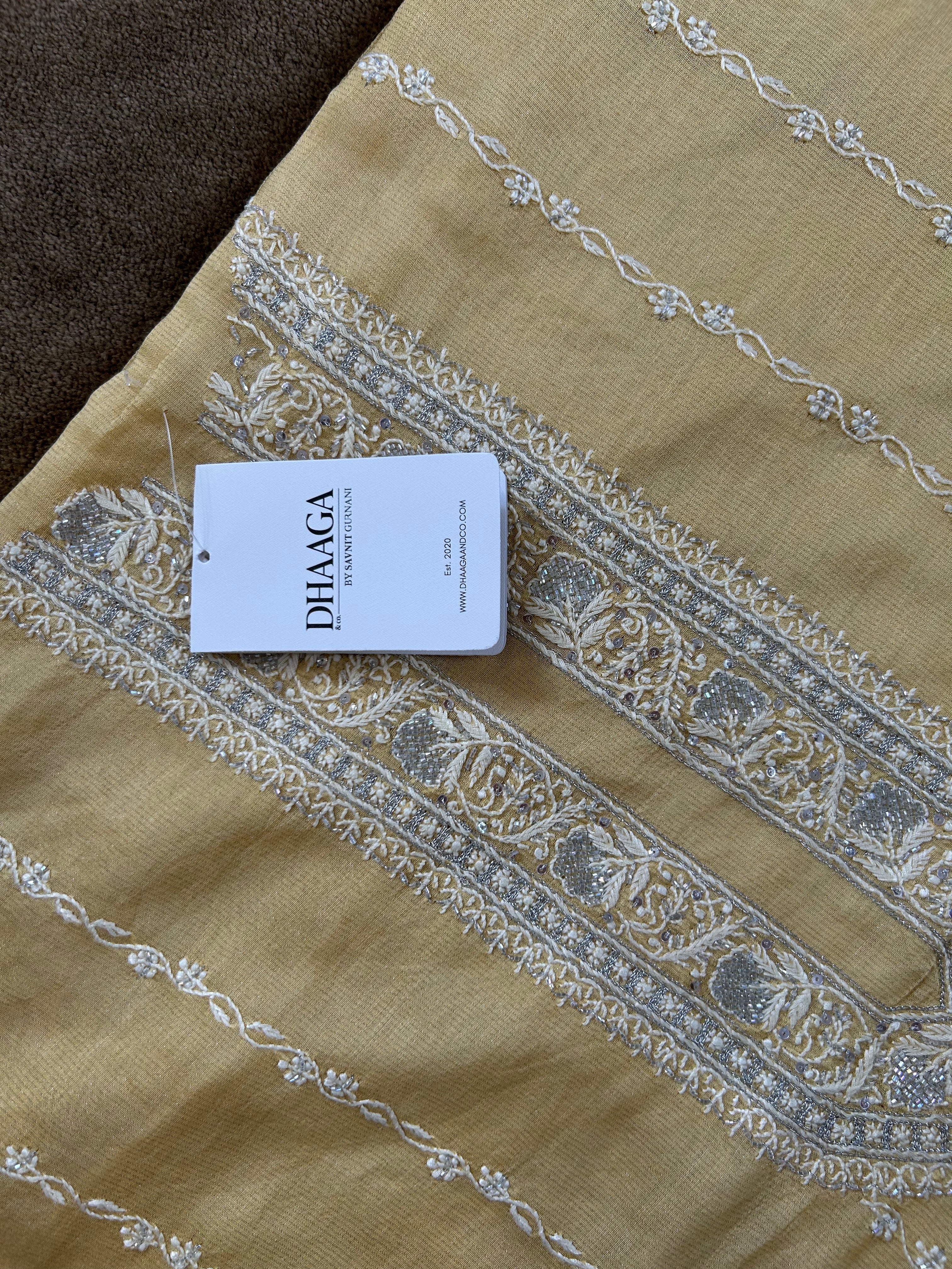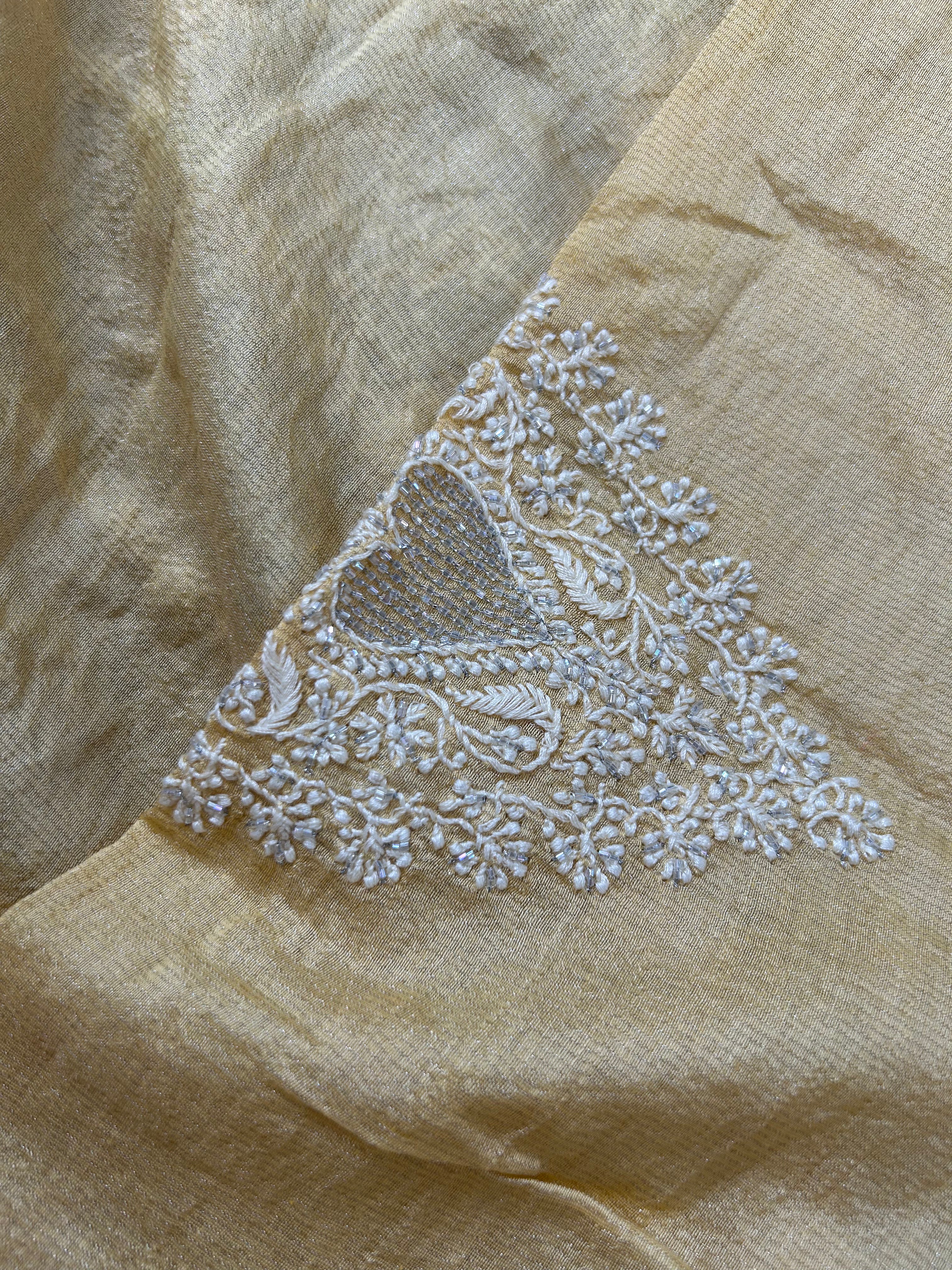 Crafted in luxurious yellow-silver tissue fabric, this mens kurta features delicate hand-embroidered Chikankari work, intricately embellished with cut dana and sequins for a subtle shimmer. A perfect blend of traditional craftsmanship and contemporary elegance ideal for festive occasions or intimate celebrations.