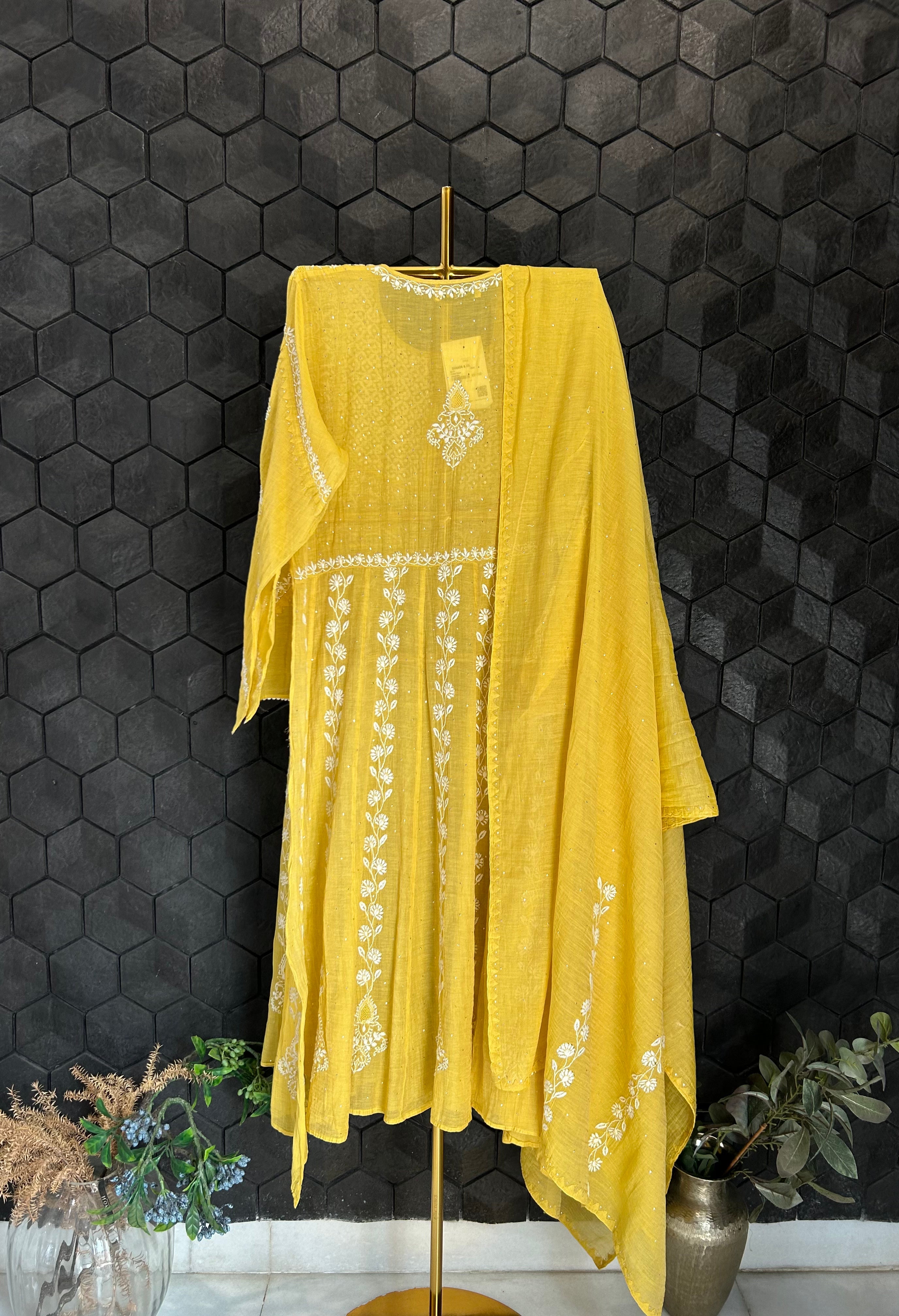 Yellow Tissue Chikankari A-Line Kurta set with intricate chikanakri and mukaish work embroidery. Paired with dupatta.